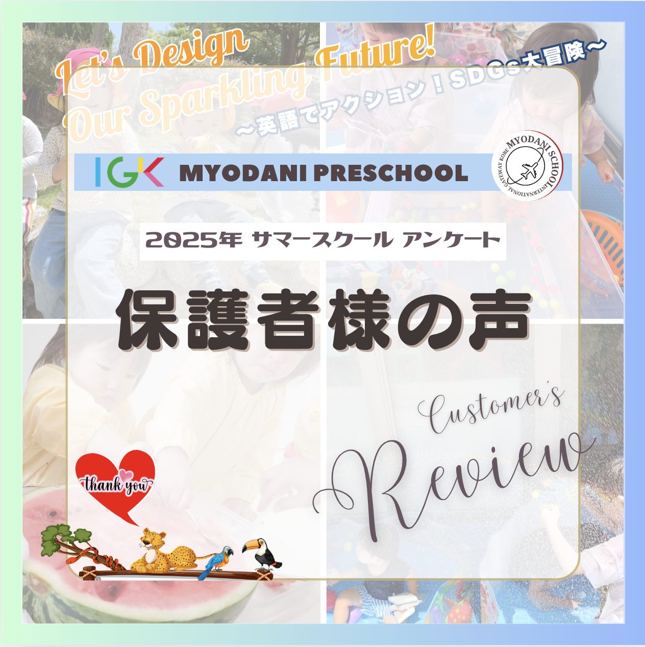 /保護者の皆様 この度は、IGKの2025年度サマースクール「Let’s Design Our Sparkling Future!~英語でアクション!SDGs大冒険~」に、大切なお子様をご参加させていただき、誠にありがとうございました。 大阪万博のテーマでもあ…